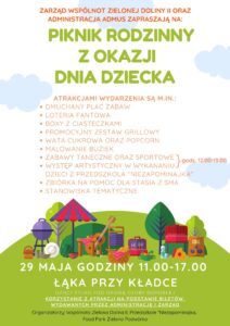 Serdecznie zapraszamy Mieszkańców osiedla Zielona Dolina II na Piknik Rodzinny z okazji Dnia Dziecka, który odbędzie się 29 maja na łące przy kładce w godzinach 11:00 – 17:00.