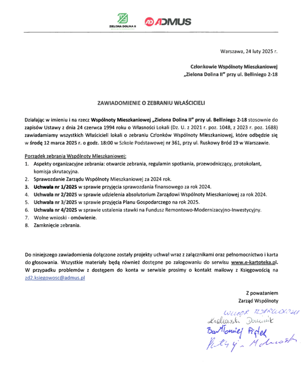 W środę 12.03.2025 r. o godzinie 18:00 w Szkole Podstawowej nr 361, przy ul. Ruskowy Bród 19 w Warszawie (wejście od ul. Verdiego), odbędzie się zebranie Członków Wspólnoty Mieszkaniowej „Zielona Dolina II” przy ul Belliniego 2-18 (parzyste).